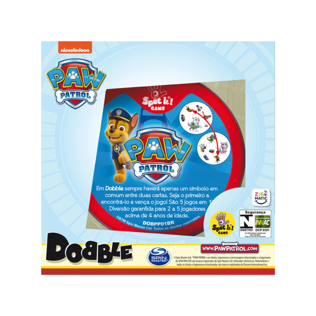 Patrulha Canina pronta para a ação! Dobble é um sucesso mundial e desta vez chegou para salvar o dia em boa companhia. Dobble Paw Patrol traz todos os elementos clássicos do jogo de cartas de velocidade e observação, junto com os filhotes mais corajosos do mundo!