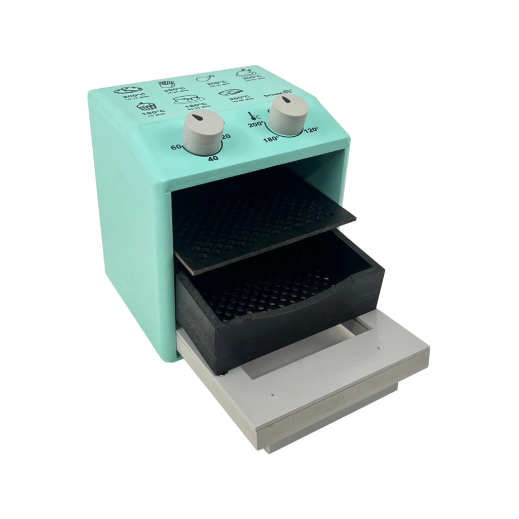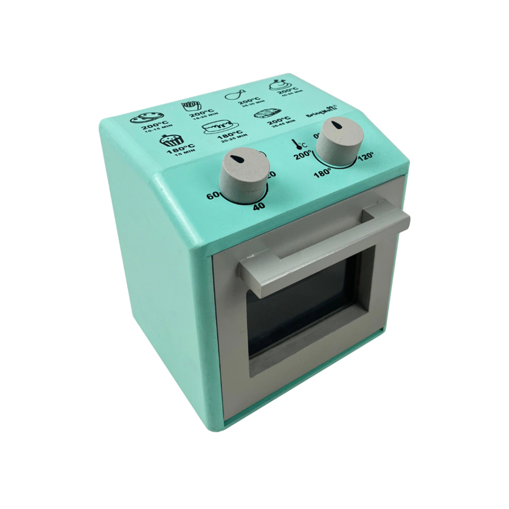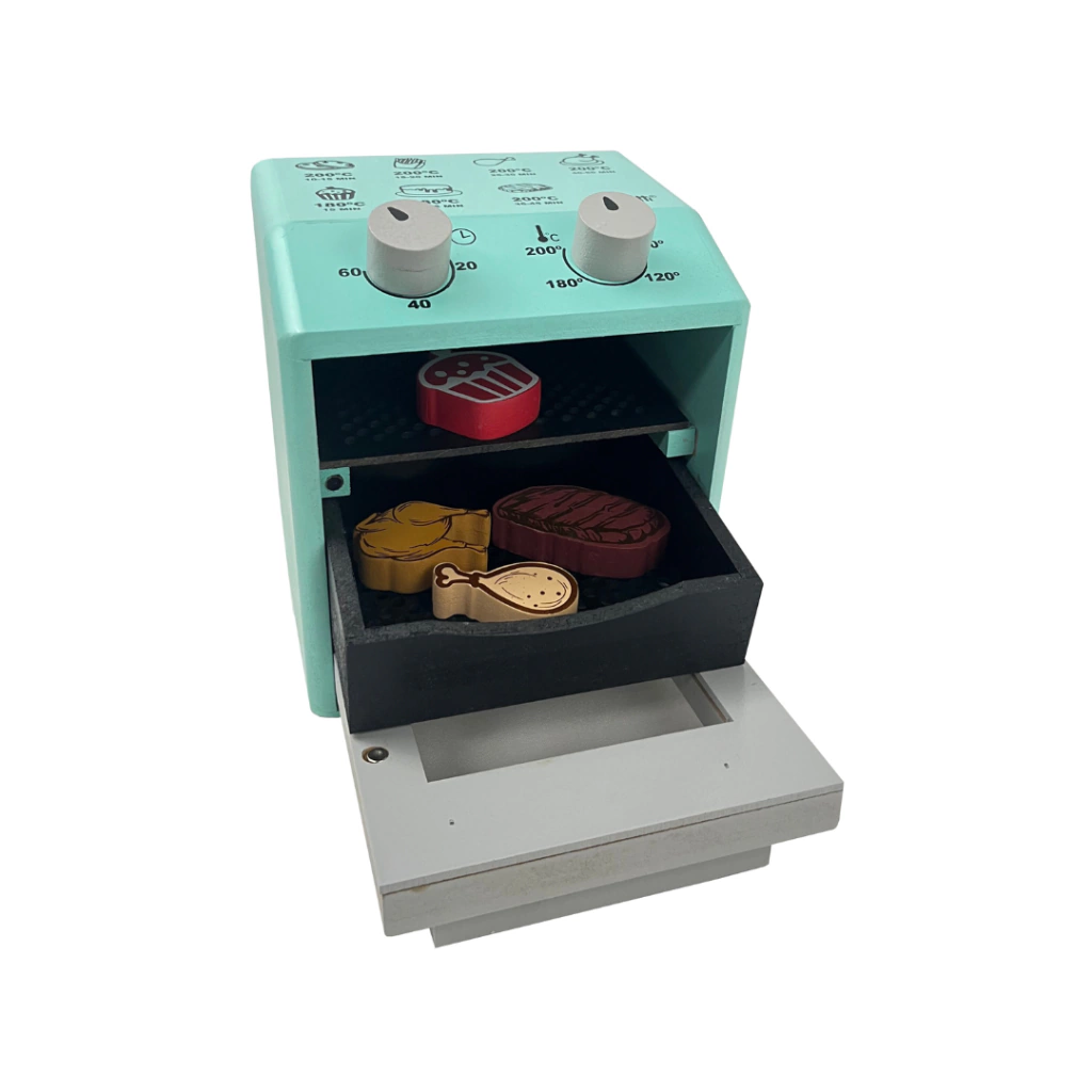 Contém: 01 brinquedo medindo 157 x 177 x 142mm, com gaveta e grelha removível, 01 frango, 01 coxa, 01 bife e 01 cupcake.