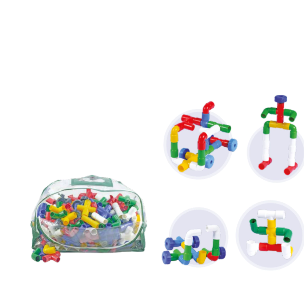 Brinquedo confeccionado em plástico polipropileno atóxico de alto brilho, contém 300 peças coloridas nos seguintes formatos: tubo simples com encaixe macho e fêmea, tubo cruz com dois encaixes machos e dois encaixes fêmeas, tubo T com dois encaixes fêmeas e um encaixe macho, tubo cotovelo com encaixe macho e fêmea, e rodinhas com eixo. Material acondicionado em sacola de PVC cristal com zíper e alça.